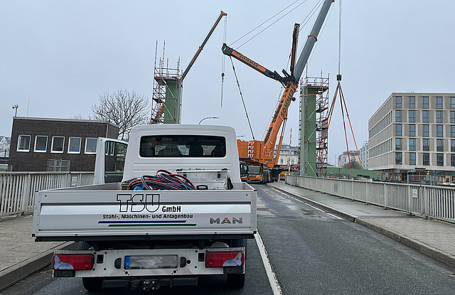 Bei Prüfungen an der Klappbrücke Schleusenstraße wurden Risse in Schweißnähten festgestellt. Um die Hafeninfrastruktur langfristig zu sichern, wird die Brücke derzeit umfassend saniert.