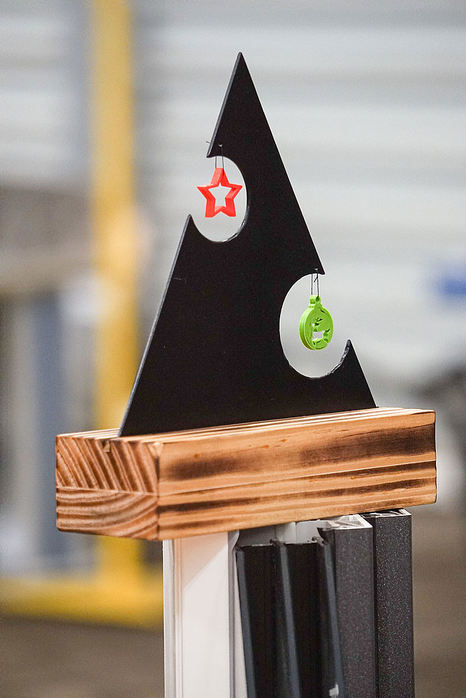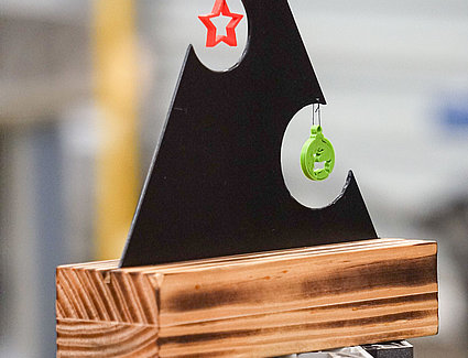 zwei kreative Deko-Weihnachtsbäume – von Schrauben & Metallplatten bis hin zu Holz, Metall und 3D-gedruckten Weihnachtskugeln.